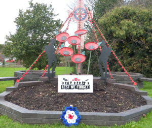 Having been hand crafted by volunteer David Gray and garlanded with a cascade of knitted Poppies produced by the village’s Knit & Natter Group and